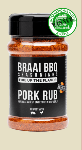 De Pork Rub van Braai BBQ is niet zomaar eentje – hij werd uitgeroepen tot beste Sweet Rub ter wereld. En als je ‘m proeft, snap je meteen waarom: een perfecte balans tussen zoet en hartig waar je instant fan van wordt.