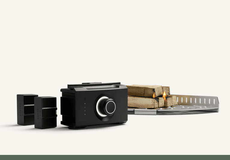 De set bevat een roestvrijstalen houtrek dat het hout van de steen houdt voor een gelijkmatige luchtstroom en een vollere vlam, plus een verwisselbare, oplaadbare USB-C batterij. Zo hou je het vuur moeiteloos onder controle en kan je blijven koken.